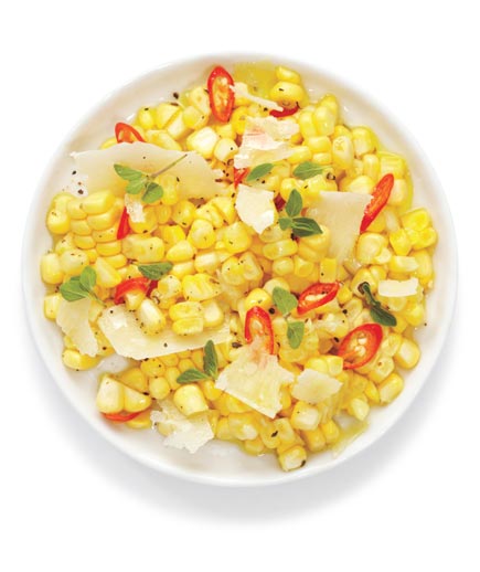 Sweet fresh corn kernels get a salty hit from shaved Parmesan; sliced red chilies provide a spicy kick.